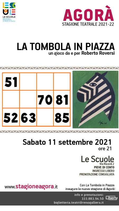 LA TOMBOLA IN PIAZZA un gioco da e per Roberto RoversiSabato 11 Settembre 2021 ore 21.00,presso Le Scuole, via Rizzoli 2 Pieve di Cento,