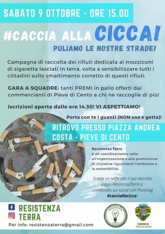 Sabato 9 ottobre, con ritrovo alle 14.30 in Piazza A. Costa, CACCIA ALLA CICCA!Un evento per lottare contro all'abbandono dei mozziconi di sigaretta: rifiuto tanto non considerato quanto molto presente e inquinante per l'ambiente.