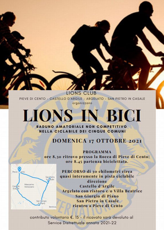 I Lions Club di Pieve di Cento, Castello d'Argile, Argelato e San Pietro in Casale, hanno organizzato un raduno ciclistico amatoriale non competitivo da effettuare nella mattinata di Domenica 17 ottobre 2021 sulla pista ciclabile di cinque comuni del circondario: Pieve di Cento, Castello d'Argile, Argelato, San Giorgio di Piano, San Pietro in Casale con ritorno a Pieve di Cento. Il percorso previsto è di circa 30 chilometri.