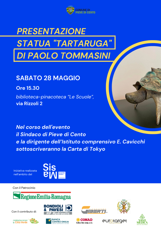 Sabato 28 maggio, alle ore 15.30 presso la biblioteca-pinacoteca “Le Scuole” presenteremo al pubblico la statua "Tartaruga" di Paolo Tommasini, gentilmente donata al Comune di Pieve di Cento.