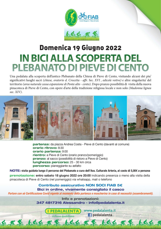 Una pedalata alla scoperta dell'antico Plebanato della Chiesa di Pieve di Cento, visitando alcuni dei piu' significativi luoghi sacri (chiese, oratorio d. Crocetta - affr. Sec. XVI , edicole votive) e altre singolarita' del territorio (area naturale cassa espansione di Ponte alto - cento). Dopo pranzo possibilità di visita della nuova pinacoteca di Pieve di Cento, con opere d'arte della tradizione religiosa locale e non solo (Madonna lignea sec. XIV).