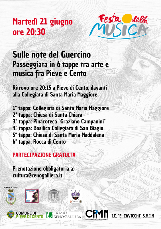 21.00 Pinacoteca G. Campanini/Le Scuole - affreschi Guercino - commento musicale Cristina Alberti, Sofia Baba, Camilla Branchini, Federico Cremonini (violino) illustrazione a cura di Francesca Tassinari... poi ci si metterà in cammino verso Cento!