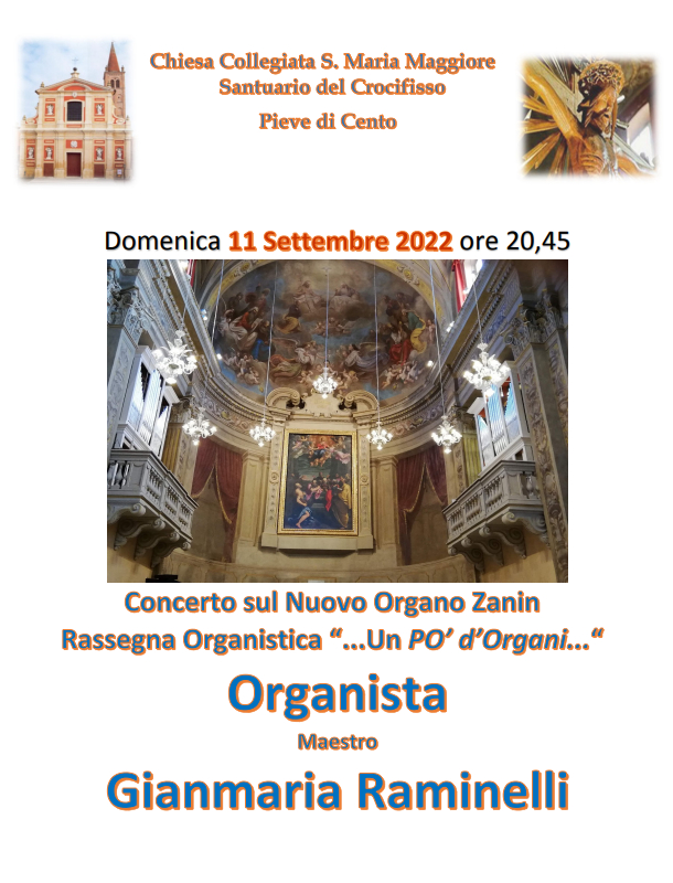 Domenica 11 settembre alle ore 20.45 presso la Collegiata di Santa Maria Maggiore di Pieve di Cento, nell'ambito della rassegna organistica " Un PO d'Organi", il