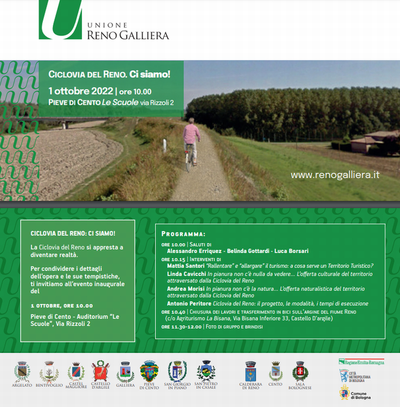 Programma10.00-10.15 | Saluti di Alessandro Erriquez, Sindaco di Castello d'Argile e Presidente dell'Unione Reno Galliera; Belinda Gottardi, Sindaca di Castel Maggiore con delega al turismo dell'Unione Reno Galliera, Luca Borsari, Sindaco di Pieve di Cento con delega alla mobilità dell'Unione Reno Galliera