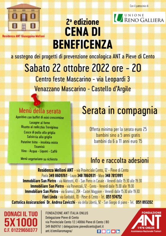 CENA DI BENEFICENZA a sostegno dei progetti di prevenzione oncologica ANT di Pieve di Cento. L'iniziativa è patrocinata dall'Unione Reno Galliera.