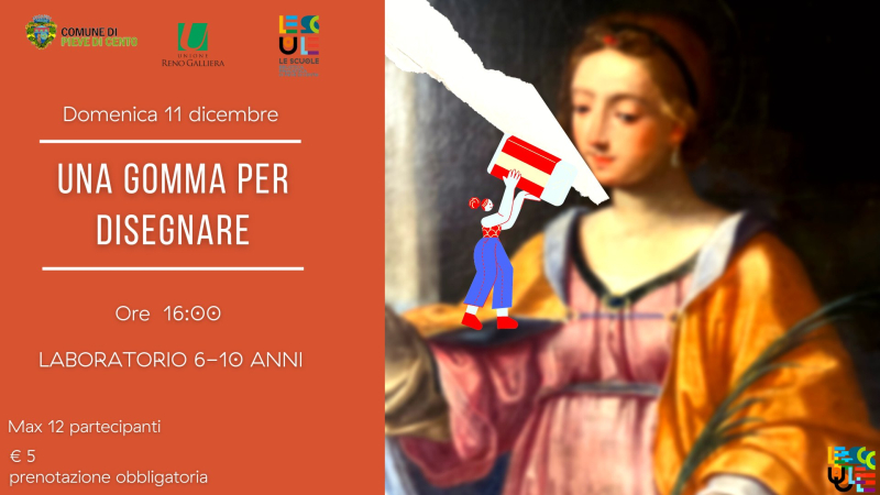 Domenica 11 dicembre alle ore 16.00 in pinacoteca “Graziano Campanini” Le Scuole - via Rizzoli 2 si terrà il laboratorio “Una gomma per disegnare” per bambini dai 6 ai 10 anni ( 12 posti, 5 euro a persona).