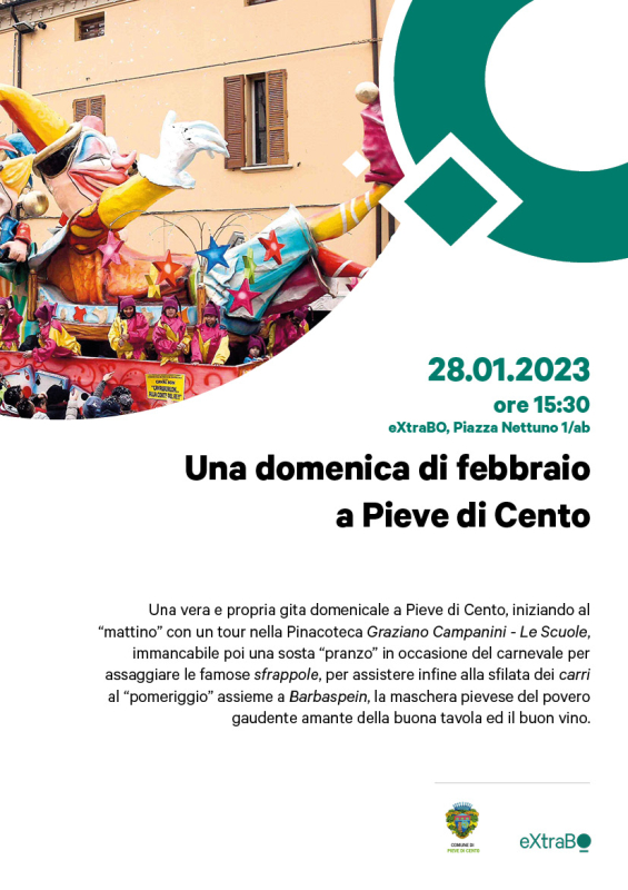 Pieve di Cento è protagonista a Bologna di un'iniziativa che mette al centro la promozione del suo carnevale storico, sabato 28 gennaio infatti, alle ore 15.30 presso eXtraBO, il punto di informazione turistica di Piazza del Nettuno, si terrà l'iniziativa Una domenica di febbraio a Pieve di Cento.