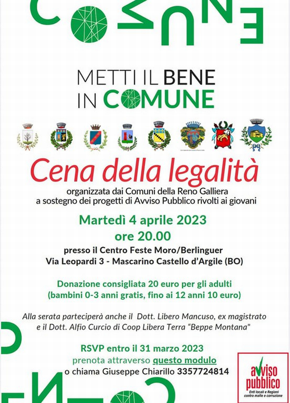 I Comuni dell'Unione Reno Galliera promuovono una cena a favore di Avviso Pubblico, di cui sono soci, e invitano i cittadini ad aderire per dare sostegno ai progetti rivolti ai giovani dell'associazione.