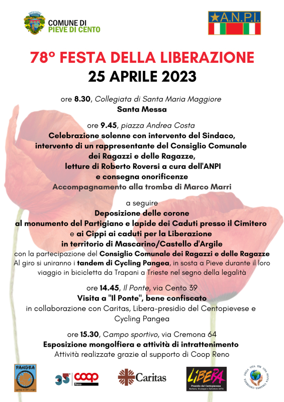 Gli appuntamenti previsti a Pieve di Cento martedì 25 Aprile, in occasione del 78° Anniversario della Liberazione dell'Italia dal nazifascismo: