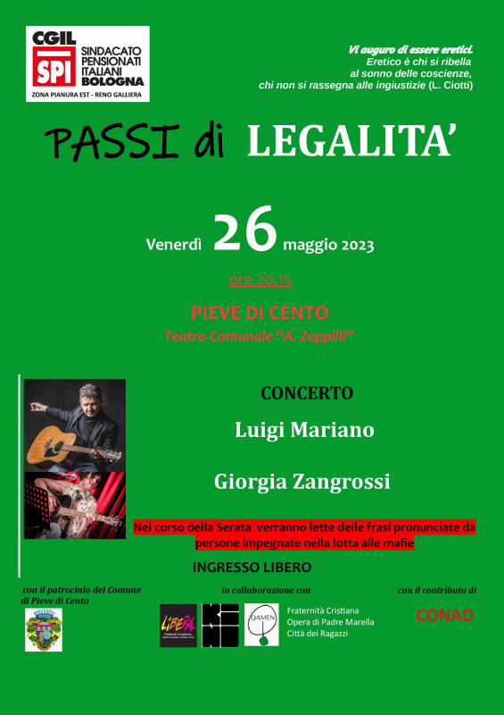 Si terrà l'evento:" Passi di Legalità" venerdì 26 maggio alle ore 20.15 in tatro con il CONCERTO di Luigi Mariano e Giorgia Zangrossi,