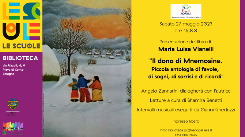 Sabato 27 maggio ore 16 si terrà la presentazione del libro di Maria Luisa Vianelli "IL DONO DI MNEMOSINE: piccola antologia di favole, di sogni, di sorrisi e di ricordi".
