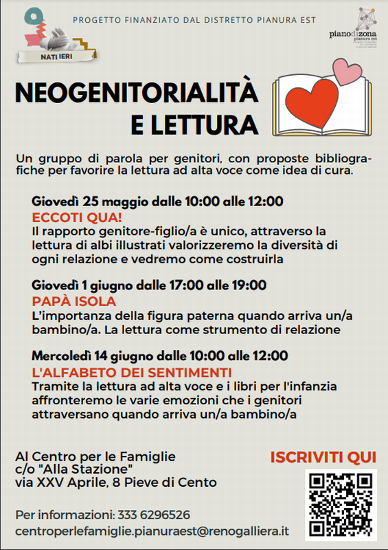L'evento fa parte del progetto "Neogenitorialità e lettura": una proposta bibliografica di titoli letterari per neo genitori, per favorire la lettura ad alta voce come concetto di cura, in sinergia con un gruppo di parola e di riflessione sulla genitorialità.