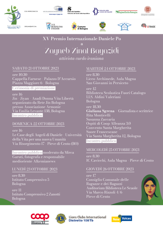 Quest'anno l'attenzione è rivolta all' IRAN e la Premiata sarà Zayneb Zinat Bayazidi, attivista curdo iraniana più volte arrestata e imprigionata per le sue idee dal regime iraniano. Giornalista, ora vive in esilio in Germania, continua a tenere alta l'attenzione sulla condizione delle donne e della minoranza curda in IRAN insieme al movimento internazionale che si riconosce nello slogan di resistenza Donna, Vita, Libertà. Sarà ospite nella nostra città e incontrerà su tutto il territorio di Città Metropolitana di Bologna studenti e cittadini portando la sua testimonianza e messaggio di pace.