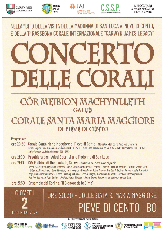 Nell'ambito della visita della Madonna di San Luca a Pieve di Cento, e della 1° Rassegna Corale Internazionale "Carwyn James Legacy", giovedì 2 novembre dalle ore 20.30 la Parrocchia presso la Collegiata di Santa Maria Maggiore di Pieve di Cento ospiterà il CONCERTO DELLE CORALI Côr Meibion Machynlleth del Galles e Santa Maria Maggiore di Pieve di Cento.