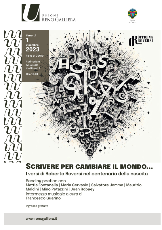 Francesco GuarinoIngresso gratuitoA conclusione del centenario della nascita di Roberto Roversi, l'Unione Reno Galliera, il Comune di Pieve di Cento ed Officina Roversi presentano un reading poetico con i versi del poeta venerdì 1 dicembre alle ore 18.00 presso l'Auditorium del Polo Culturale Le Scuole di Pieve di Cento.