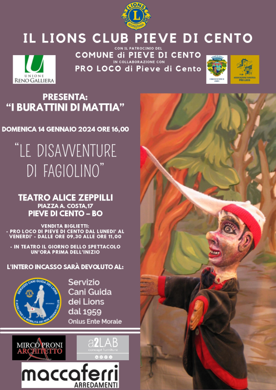 "Le disavventure di Fagiolino"Spettacolo di burattini di MattiaDomenica 14 gennaio 2024 alle ore 16.00 presso il Teatro comunale Alice Zeppilli, in Piazza A. Costa 17.