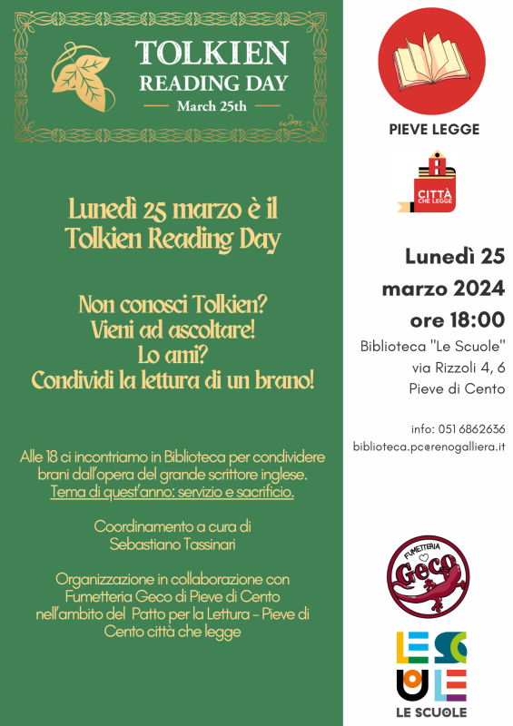 In occasione del Tolkien Reading Day, lunedì 25 marzo alle ore 18.00 si terrà un incontro per condividere brani dell'opera del grande scrittore inglese.