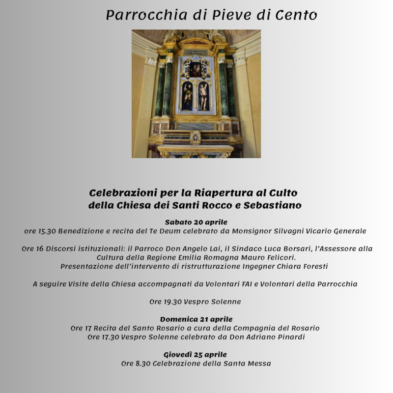 si terrà la cerimonia di riapertura della Chiesa dei Santi Rocco e Sebastiano, duramente colpita dal sisma del 20-29 maggio 2012, alla presenza dell'assessore alla Cultura della Regione Emilia-Romagna Mauro Felicori.