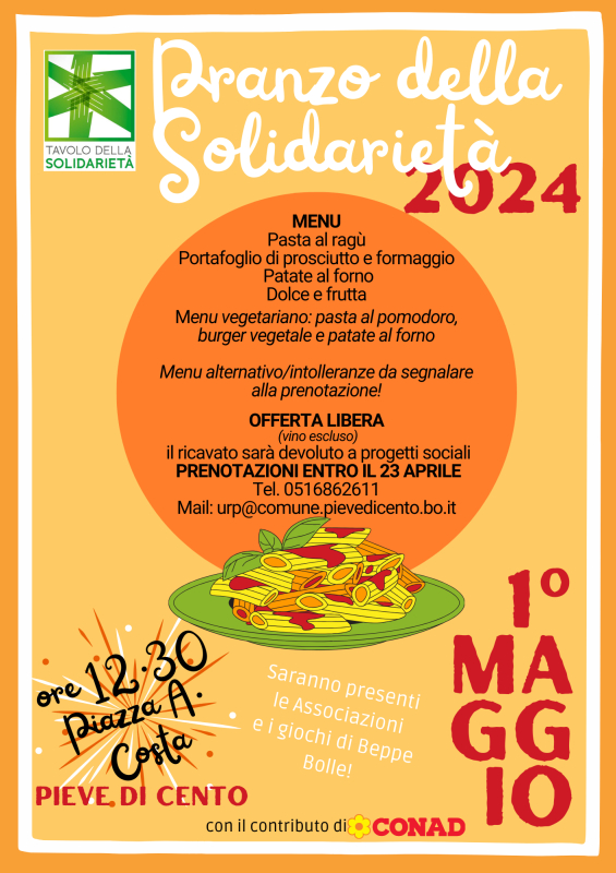 Il pranzo è a offerta libera, e il ricavato sarà destinato ad attività sociali da realzzarsi a favore della comunità di Pieve di Cento, in accordo con le Associazioni del Tavolo.