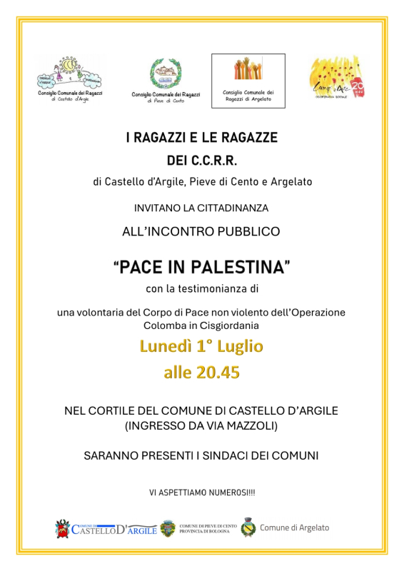 Lunedì 1 Luglio 2024 alle ore 20.45 presso il Cortile del Municipio di Castello d'Argile i Consigli Comunali dei Ragazzi e delle Ragazze di Pieve di Cento, Castello d'Argile e Argelato organizzano