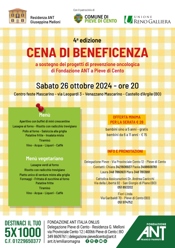 CENA DI BENEFICENZA a sostegno dei progetti di prevenzione oncologica di Fondazione ANT presso la struttura Residenza ANT Giuseppina Melloni di Pieve di Cento, a cura di Fondazione ANT Italia Onlus.