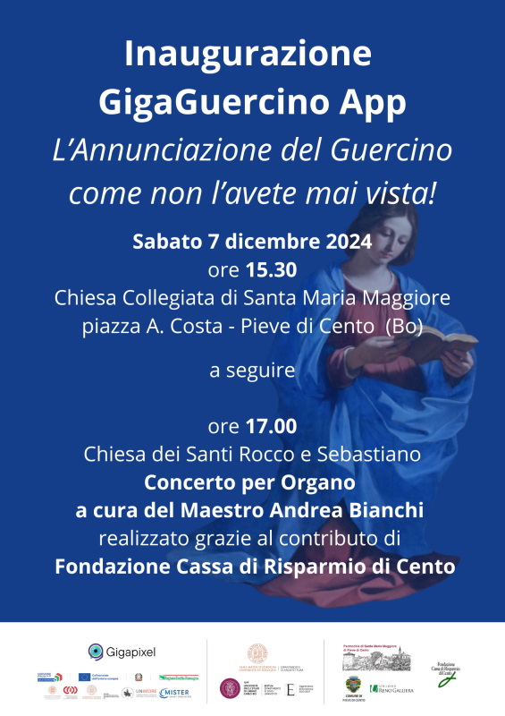 contributo di Fondazione Cassa di Risparmio di Cento."GigaGuercino App" è un'originale e innovativa tecnologia digitale per surrogare, studiare ed esplorare “Annunciazione”, capolavoro realizzato nel 1646 da Giovanni Francesco Barbieri detto il “Guercino”, nata dalla collaborazione tra GIGAPIXEL (un progetto di ricerca industriale volto alla promozione e conservazione digitale del patrimonio artistico, storico e culturale della regione Emilia-Romagna e approvato sul “Bando per progetti di ricerca industriale strategica rivolti agli ambiti prioritari della strategia di specializzazione intelligente 2023-2024”), Dipartimento di Architettura dell'Alma Mater Studiorum Università di Bologna, Dipartimento di Studi Umanistici dell'Università degli studi di Urbino.