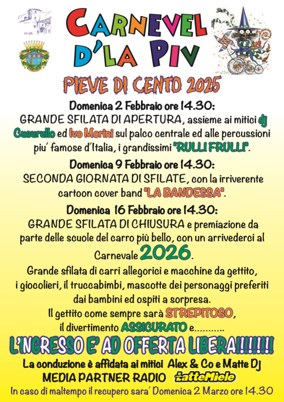 Domenica 16 Febbraio dalle ore 14.30 si terrà la grande sfilata di chiusura e la proclamazione vincitore del concorso “Il carro più bello” promosso dalle scuole di Pieve di Cento.