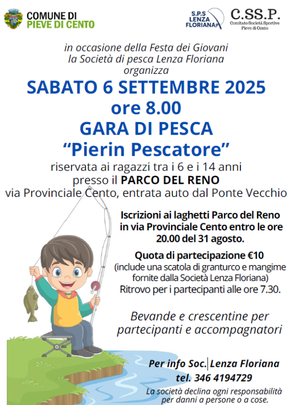 SABATO 6 SETTEMBRE 2025 alle ore 8.00la storica GARA DI PESCA “Pierin Pescatore”riservata ai ragazzi tra i 6 e i 14 anni