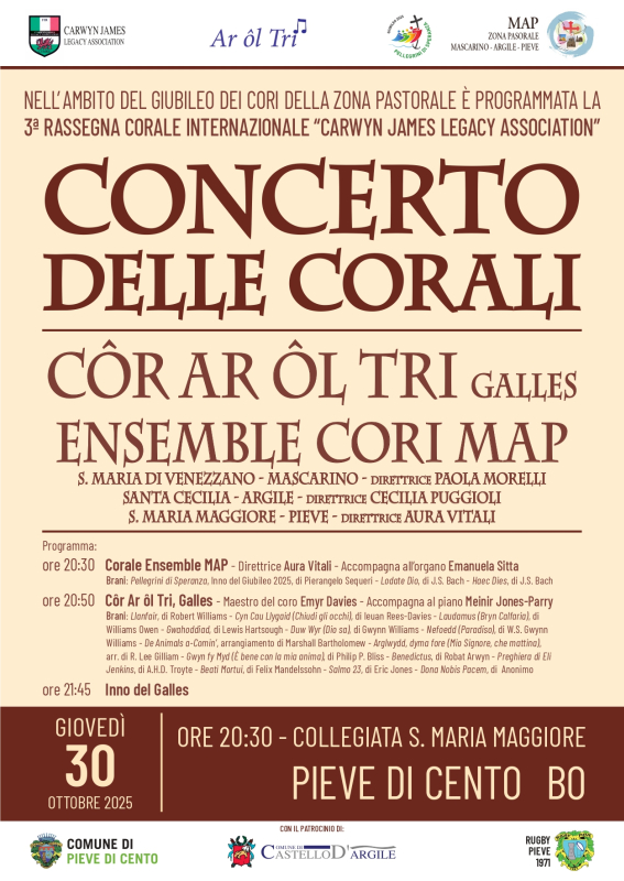 Collegiata di Santa Maria Maggiore, nell'ambito del Giubileo dei Cori della zona pastorale è programmata la 3ª Rassegna Corale Internazionale “Carwyn James Legacy Association”, con il