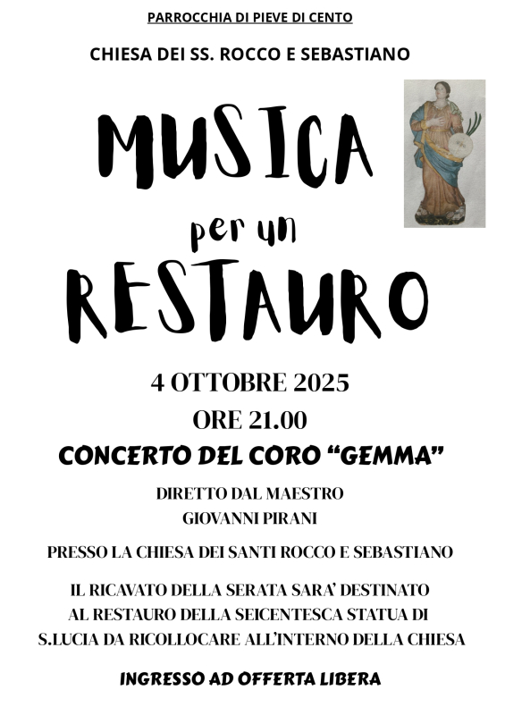 IL RICAVATO DELLA SERATA SARA' DESTINATO AL RESTAURO DELLA SEICENTESCA STATUA DI S.LUCIA DA RICOLLOCARE ALL'INTERNO DELLA CHIESA.