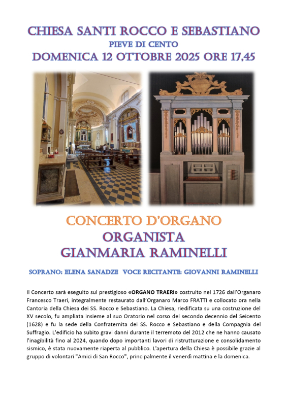 sarà eseguito sul prestigioso «ORGANO TRAERI» costruito nel 1726 dall'Organaro Francesco Traeri, integralmente restaurato dall'Organaro Marco FRATTI e collocato ora nella Cantoria della Chiesa dei SS. Rocco e Sebastiano. La Chiesa, riedificata su una costruzione del XV secolo, fu ampliata insieme al suo Oratorio nel corso del secondo decennio del Seicento (1628) e fu la sede della Confraternita dei SS. Rocco e Sebastiano e della Compagnia del Suffragio.