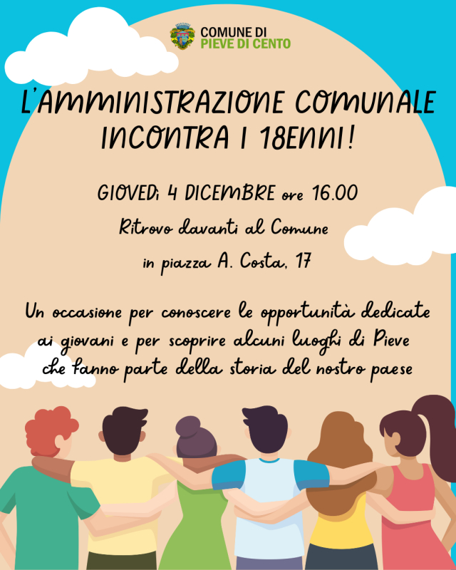 Sono invitati quindi per un piccolo incontro con l'Amministrazione Comunale tutti i ragazzi e le ragazze di Pieve che nel 2025 hanno compiuto (o stanno per compiere) 18 anni: sarà l'occasione per conoscere le opportunità dedicate ai giovani e per scoprire alcuni luoghi di Pieve che fanno parte della storia del nostro paese.