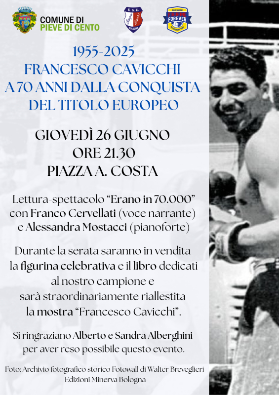 Il 26 giugno 1955 Francesco “Cesco” Cavicchi, pugile di Pieve di Cento cresciuto nella Società Sempre Avanti di Bologna,