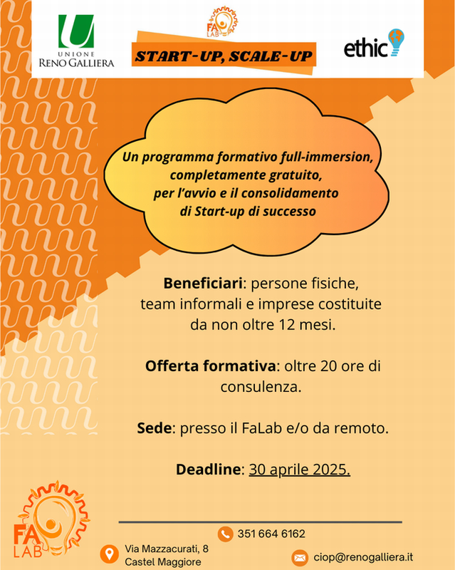 A partire dal 2 aprile 2025 è possibile candidarsi a Start-Up Scale-Up, il programma gratuito di formazione e networking dedicato a chi desidera avviare o consolidare una start-up. Il percorso, promosso nell'ambito del progetto FaLab, offre un'opportunità concreta per acquisire competenze imprenditoriali e definire un modello di business efficace.