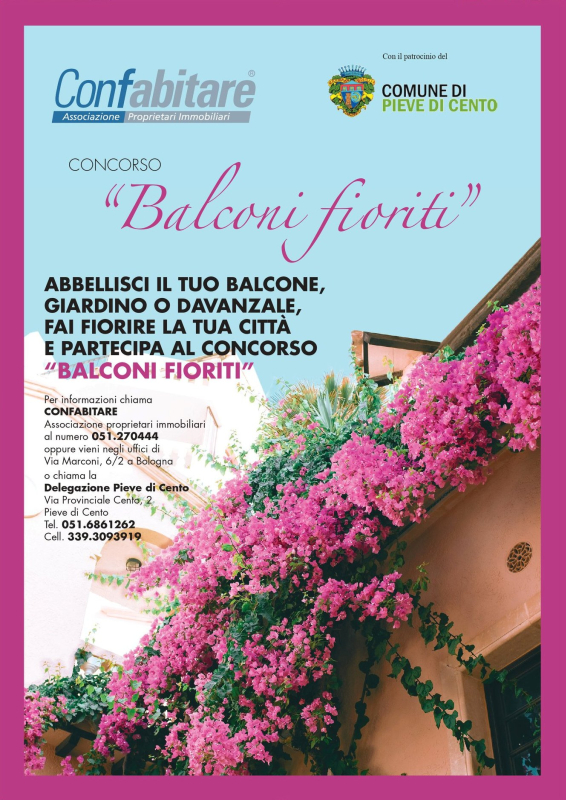 È organizzato da Confabitare - Associazione proprietari immobiliari - con il patrocinio del Comune di Pieve di Cento il concorso a premi “Balconi fioriti”: la partecipazione è gratuita e il concorso è aperto a tutti i cittadini del Comune di Pieve di Cento.