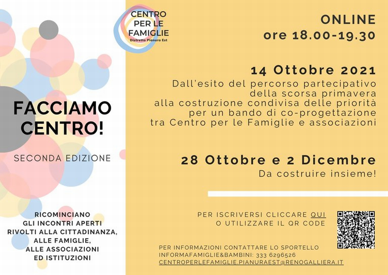 - Giovedì 14 ottobre: Dall'esito del percorso partecipativo della scorsa primavera alla costruzione condivisa delle priorità per un bando di co-progettazione tra Centro per le famiglie e associazioni del territorio