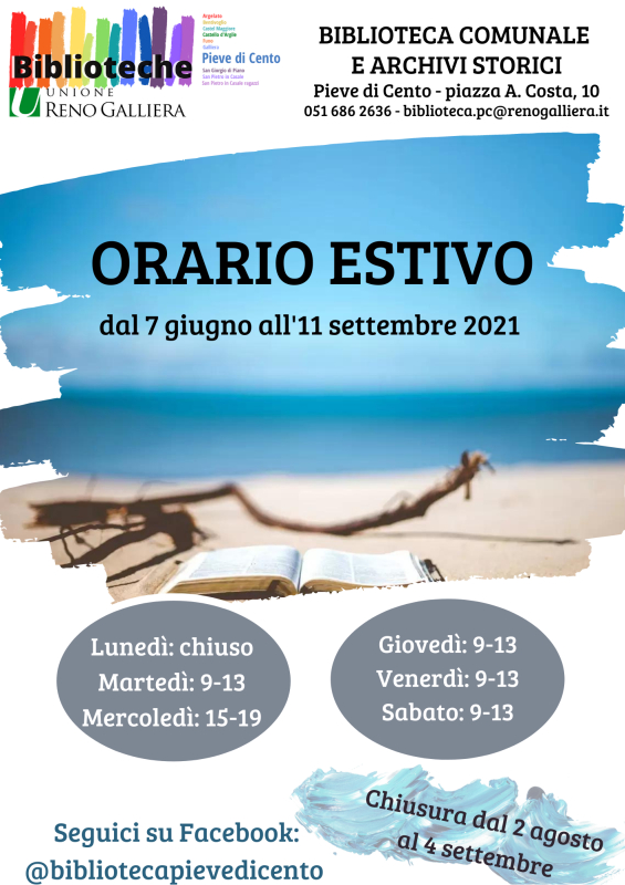 Si comunica che da lunedì 7 giugno la Biblioteca comunale rispetterà l'orario d'apertura estivo.