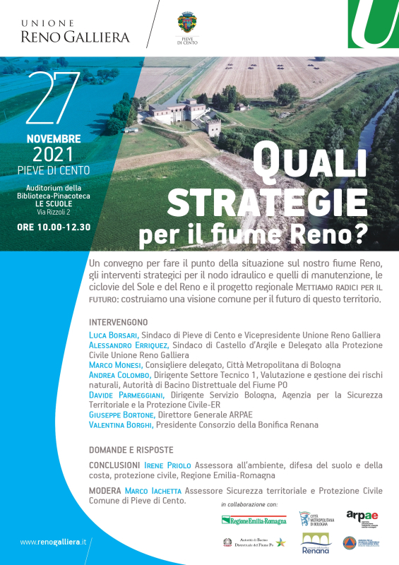 Sabato 27 novembre si è tenuto presso l'Auditorium della Biblioteca-Pinacoteca Le Scuole (via Rizzoli 2), l'incontro "Quali strategie per il fiume Reno? Un convegno per fare il punto della situazione", durante il quale si ci è confrontati sugli interventi strategici per il nodo idraulico e quelli di manutenzione, le ciclovie del Sole e del Reno e il progetto regionale Mettiamo radici per il futuro: costruiamo una visione comune per il futuro di questo territorio.