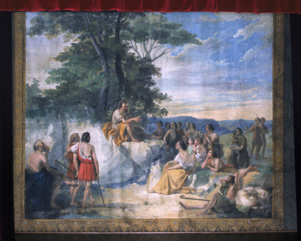 A fondale del palcoscenico è collocato il sipario realizzato da Adeodato Malatesta (1806-1891) raffigurante Esopo che parla ai pastori. Il telero, composto da 11 tele cucite per una dimensione di 5,80 x 7,30 m, è stato restaurato da Licia Tasini.